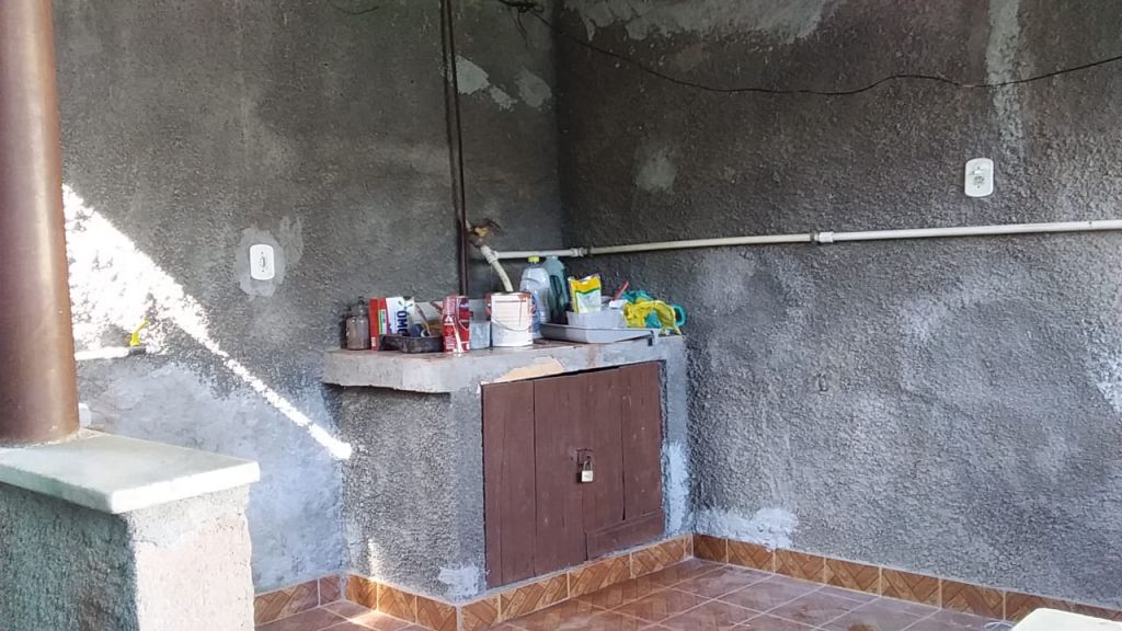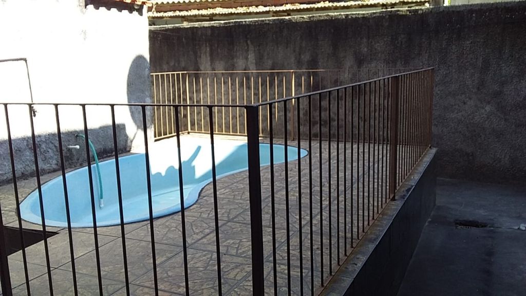 Casa com dois dormitórios, sala, cozinha, banheiro, área de serviço, área gourmet com piscina.